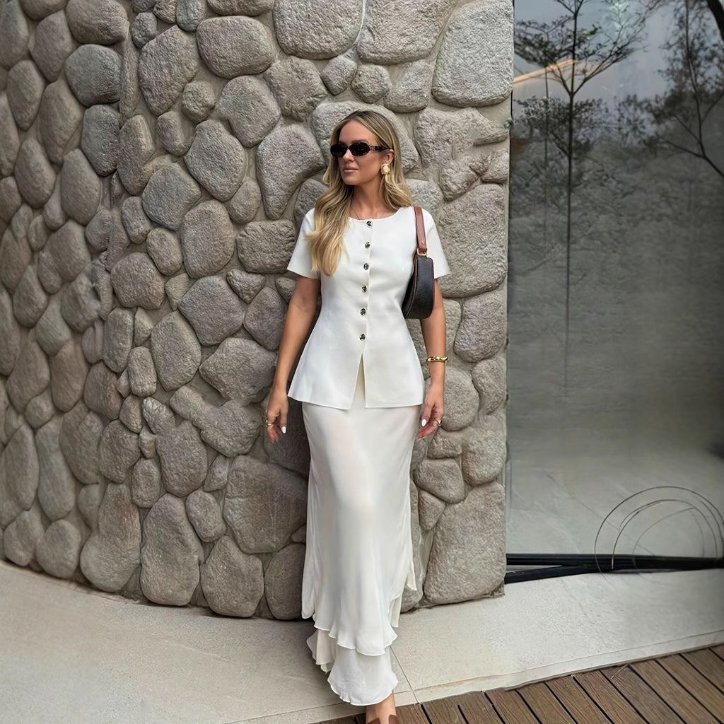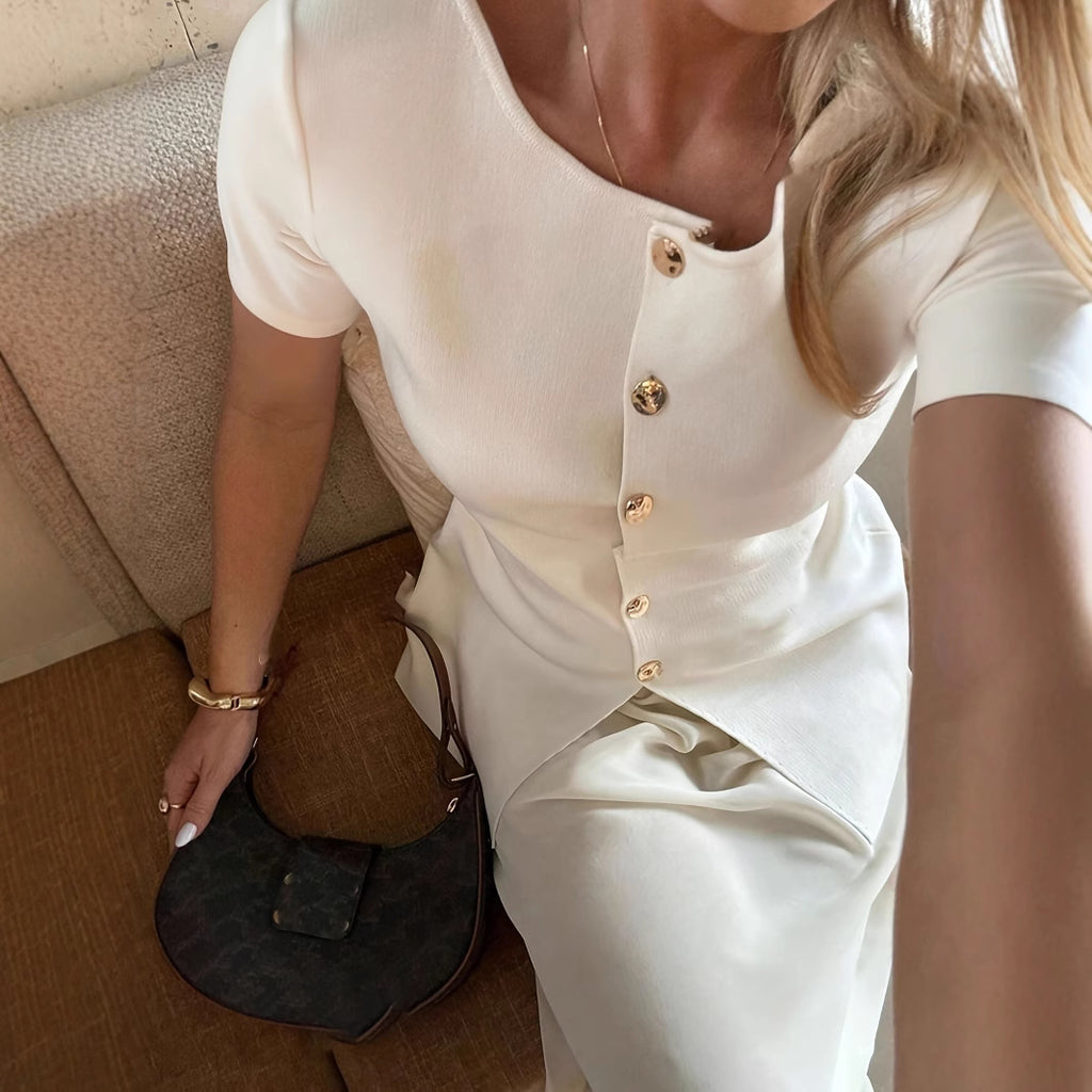 Women's Round Neck Metal Button Design Solid Color Short Sleeve
