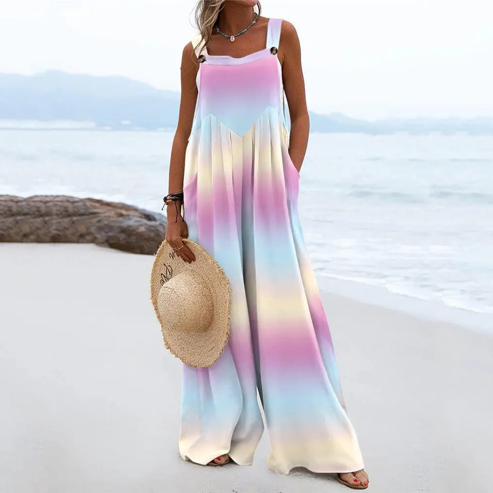 Agregue un toque elegante a su guardarropa de verano con este traje pantalón sin mangas con cintura imperio para mujer con pantalones de pierna ancha. Viene en varios colores y patrones, cada uno atrevido y llamativo.