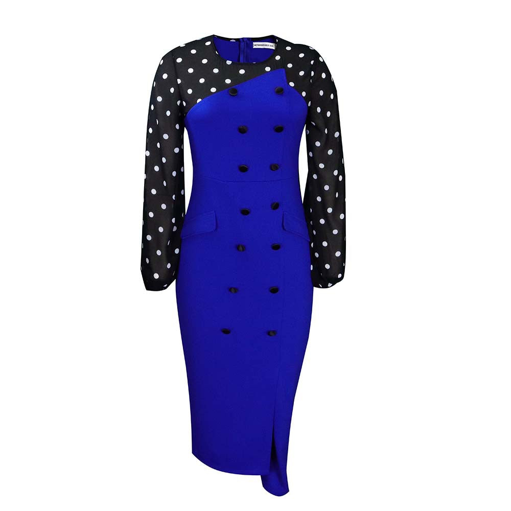 Transforme su ropa de trabajo eligiendo el vestido de lápiz con botones y lunares para mujer. Este vestido midi presenta una falda de lápiz de color sólido con botones de acento, así como una blusa de lunares de manga larga.