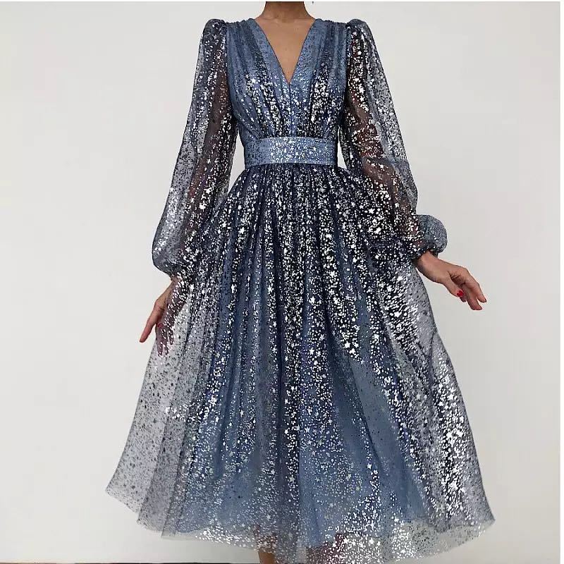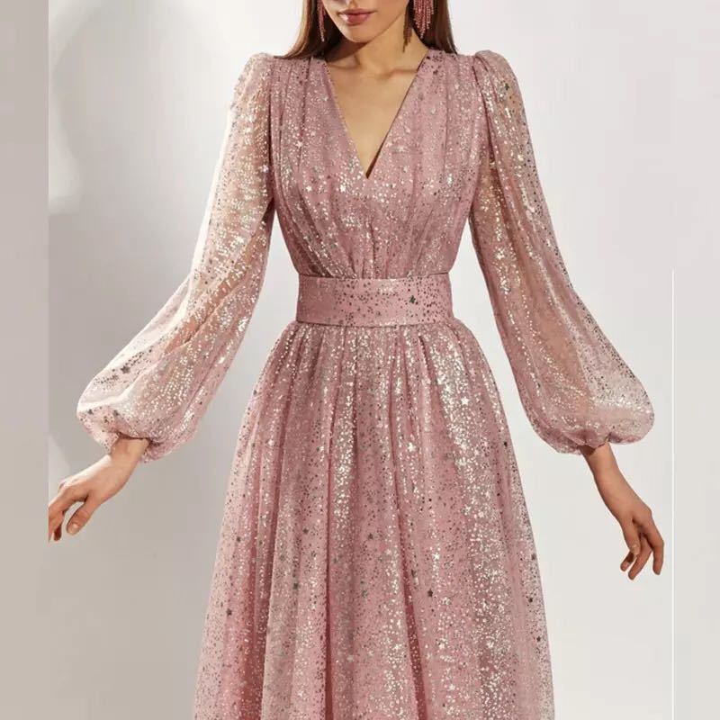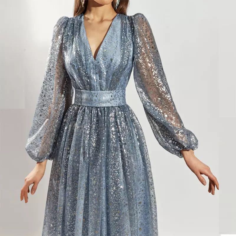 Luce como una princesa en tu próximo evento formal con el vestido de fiesta de manga larga con cuello en V para mujer con falda abullonada. El diseño está diseñado con materiales transparentes y detalles brillantes que lo hacen brillar y resplandecer.