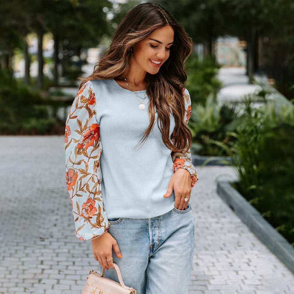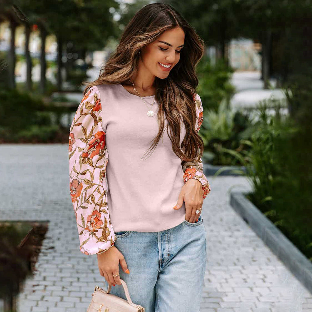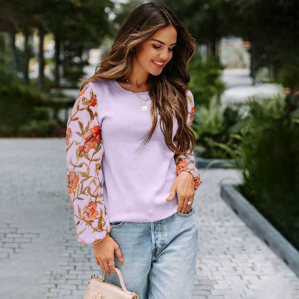 पुष्प ढीली फिटिंग आस्तीन के साथ महिलाओं की लंबी आस्तीन शर्ट के साथ पुष्प पैटर्निंग का रूप प्राप्त करें। शर्ट अपने ठोस रंगों के साथ केवल लंबी आस्तीन पर विवरण द्वारा उच्चारण किए जाते हैं।
