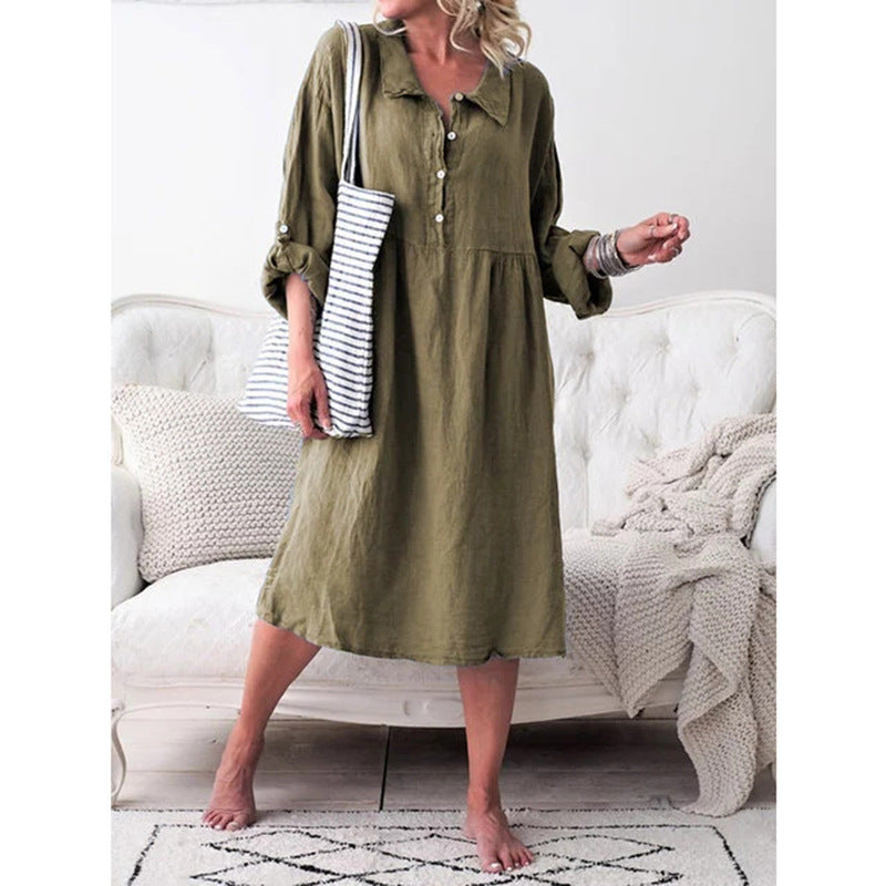 टर्न-डाउन कॉलर के साथ फ्रॉक स्टाइल मिडी ड्रेस