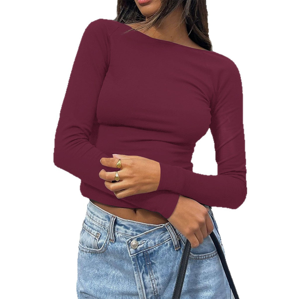 Chic Slim-fit Long-sleeve Solid-color Base T-shirt For Women