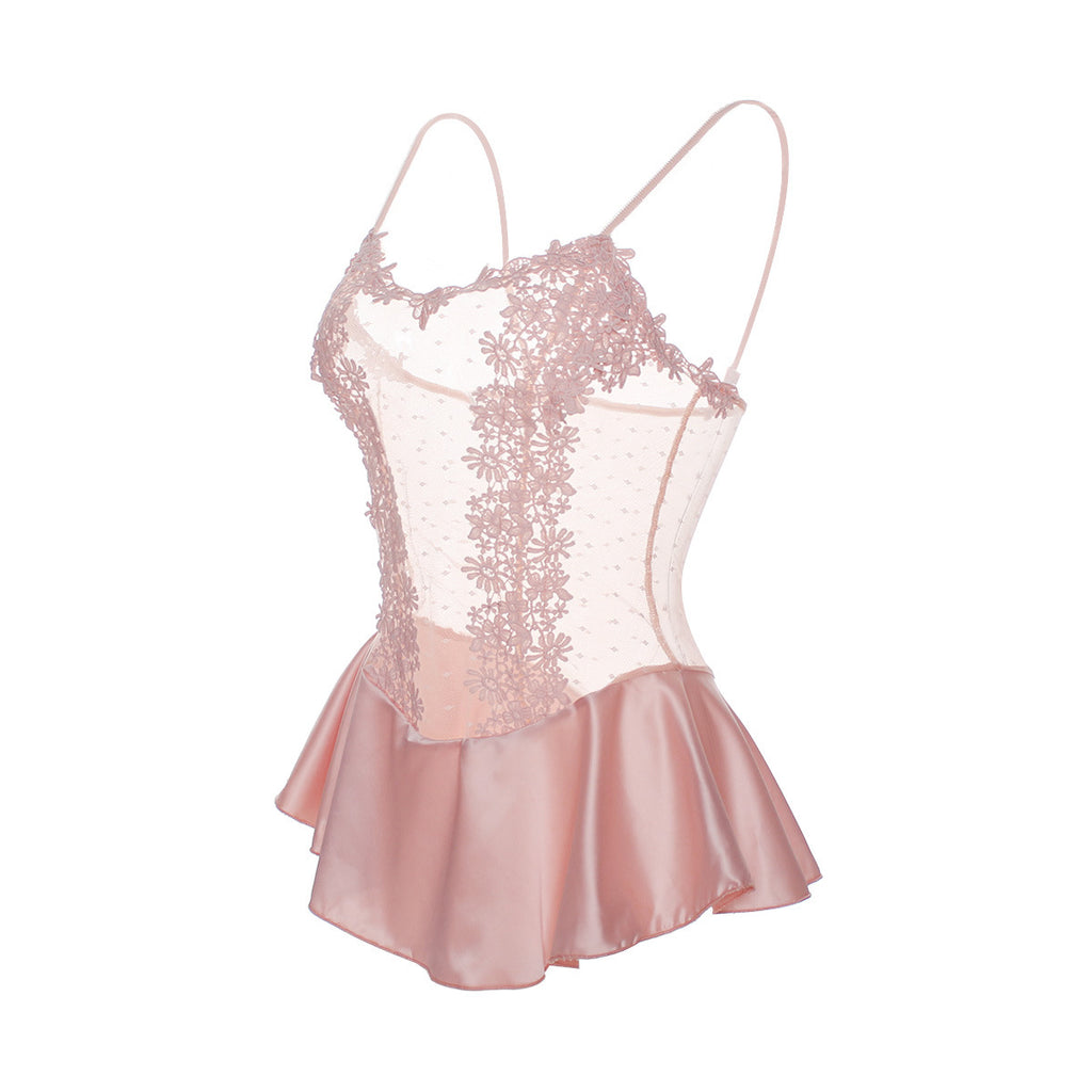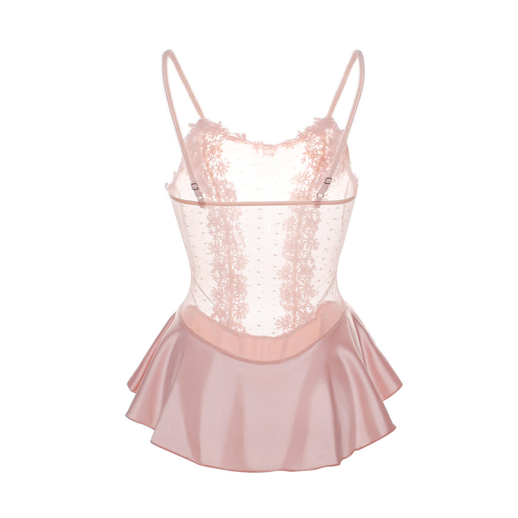 レースの輪郭とフリル、絹のような短いスカートを備えた、このすっきりとした遊び心のあるスカートのピーカブーレースボディステディであなたの恋人を誘惑します。