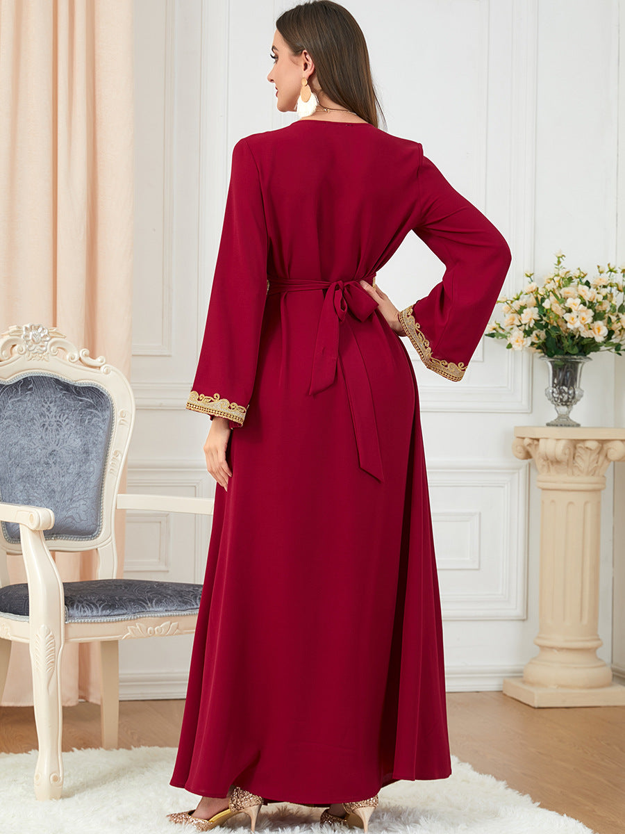 Look stunning in the Women's Crimson Long Sleeve Maxi Gown complete with intricately detailed golden trim along the hem, sleeves and neckline.