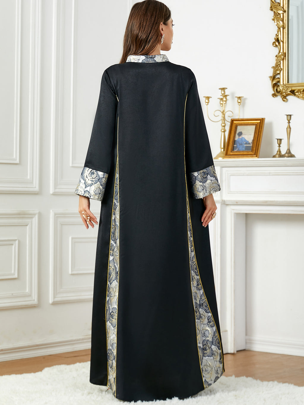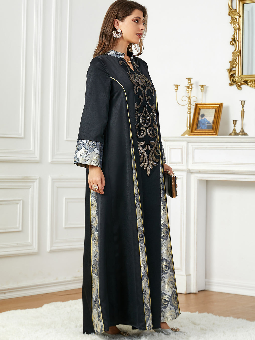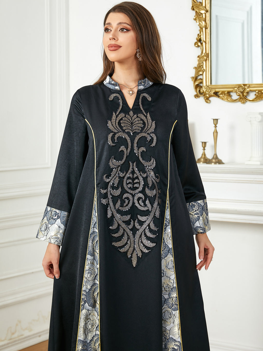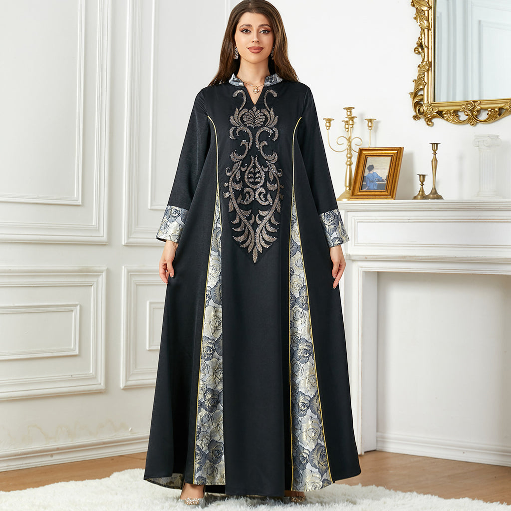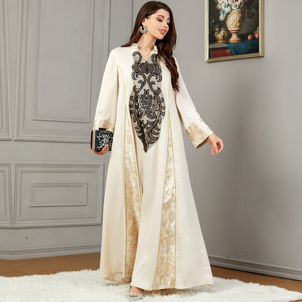 Stand out wherever you go in this Women's Elegant Long Sleeve Maxi Dress with Turn Down Collar. It comes in your choice of champagne and black or blue and silver.