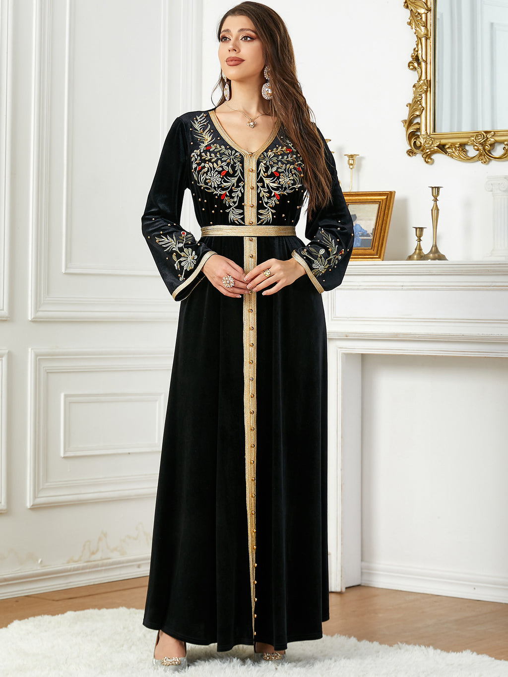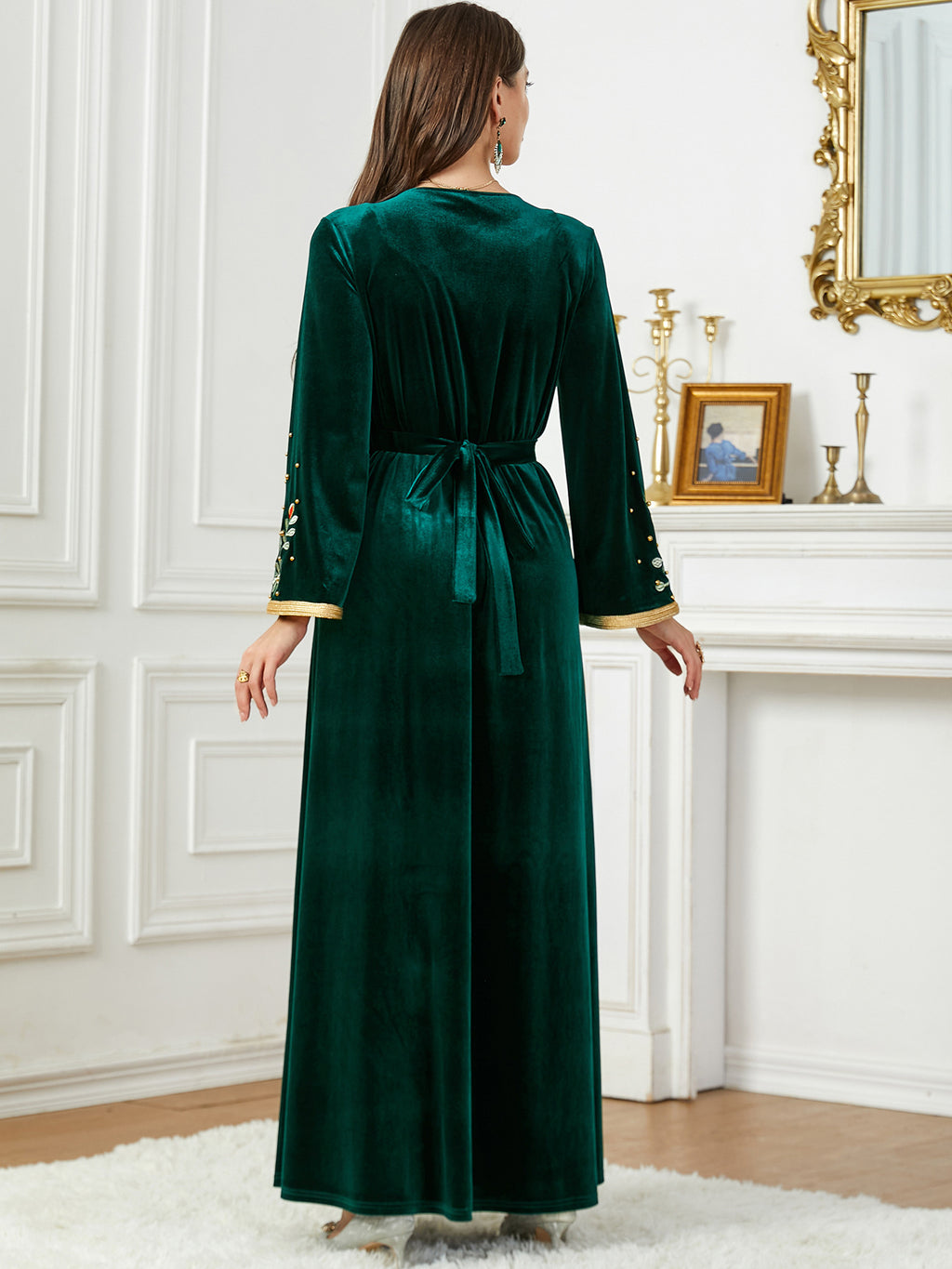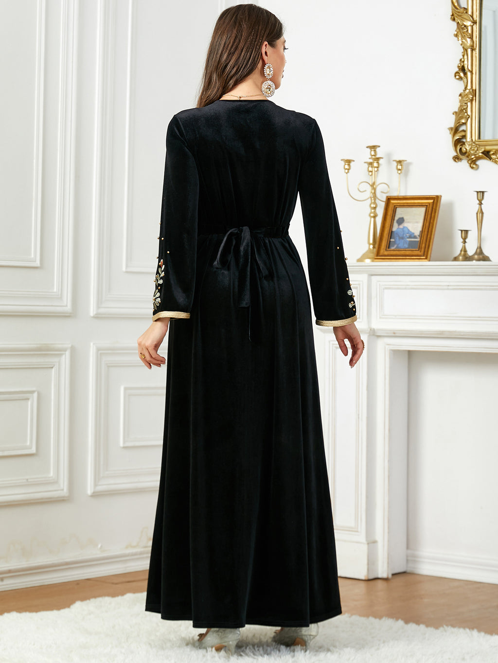 Dames met lange mouw fluwelen maxi -jurk met gouden afwerking