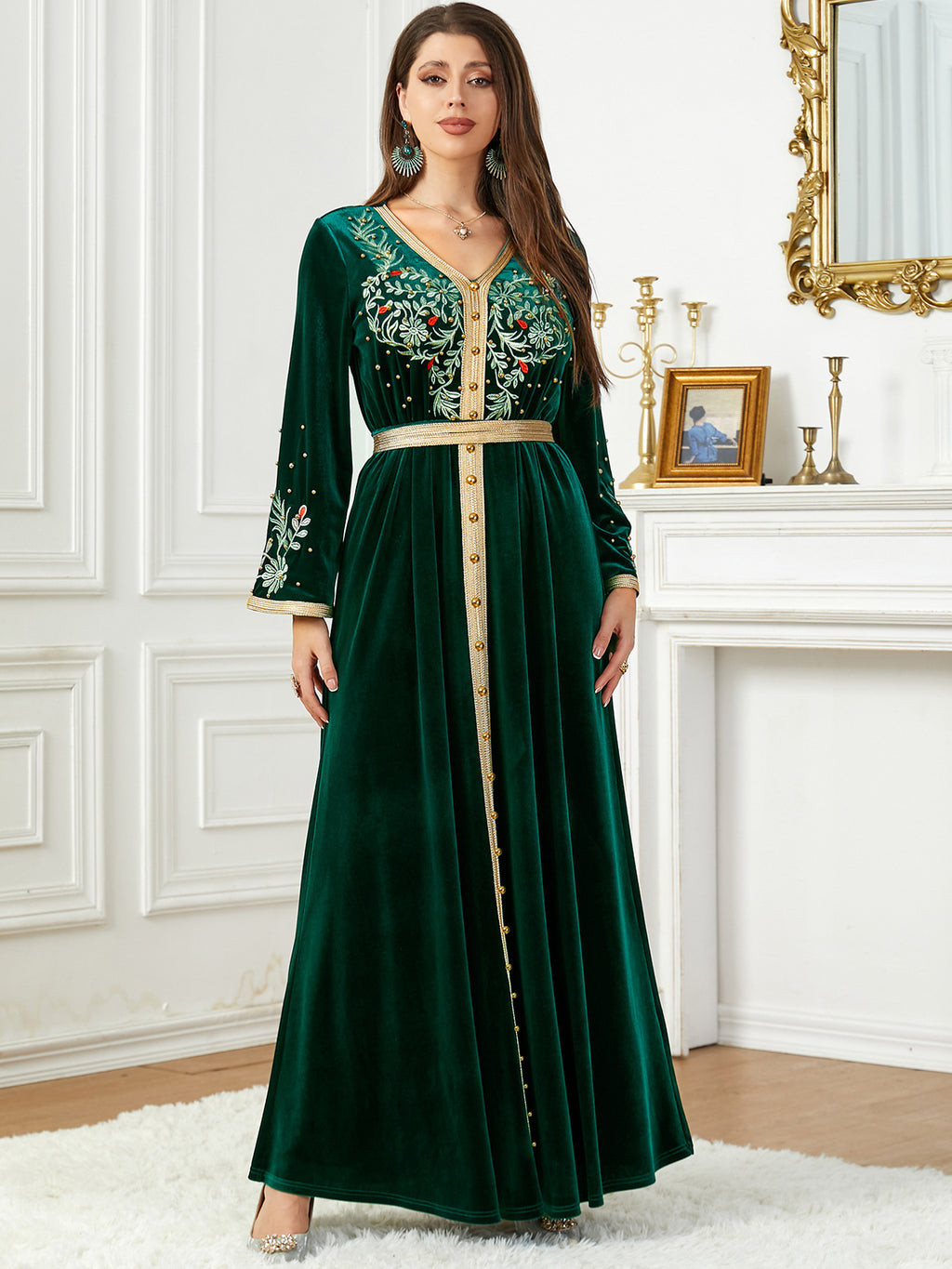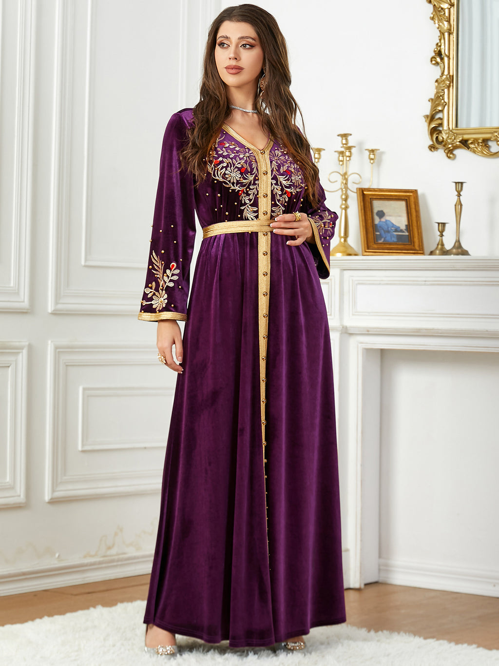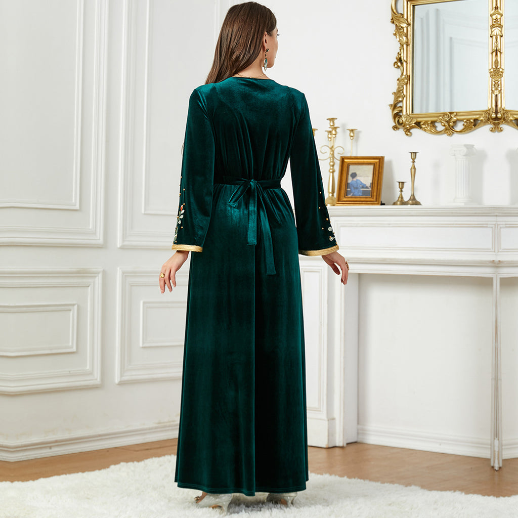 Dames met lange mouw fluwelen maxi -jurk met gouden afwerking