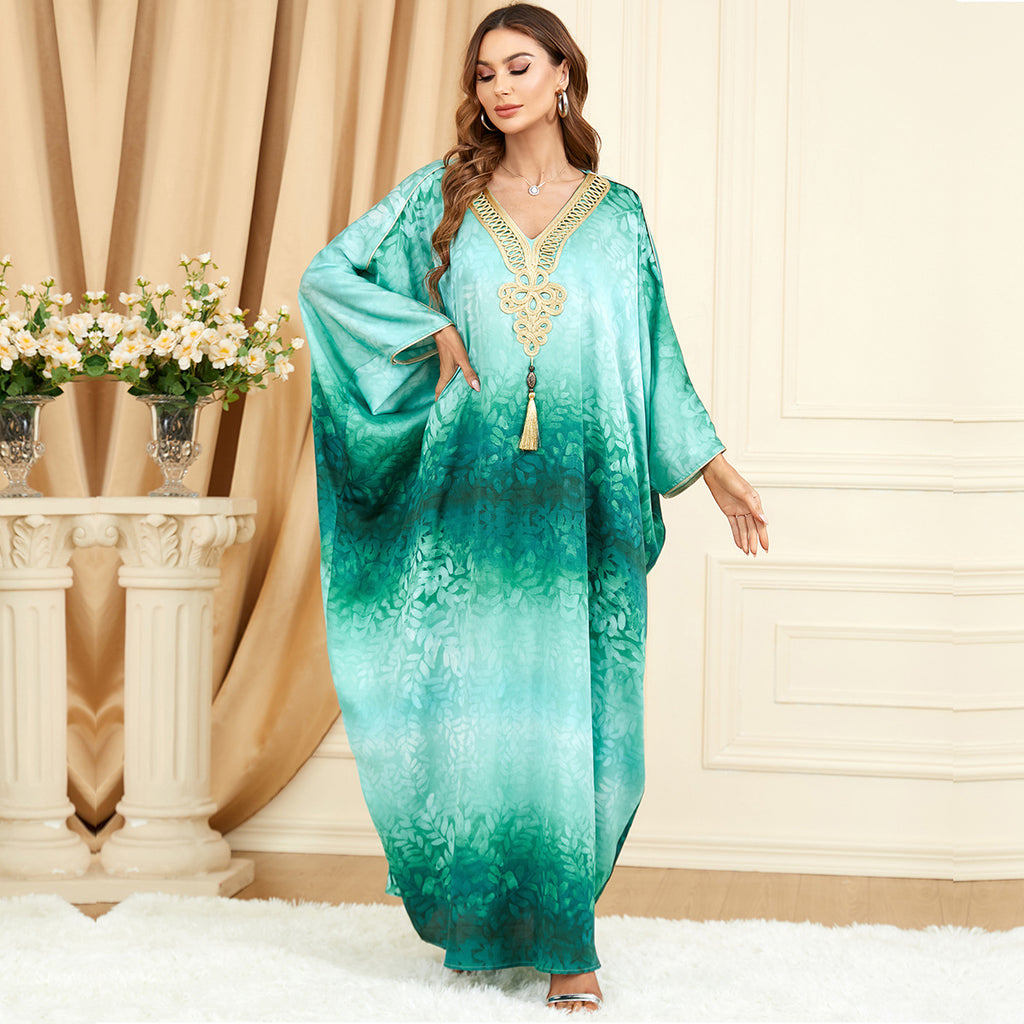 Shimmer en glans met de dames ombre groene jurk met lange mouwen met een gouden ontwerp langs het lijfje en een bijpassende gouden kwast.