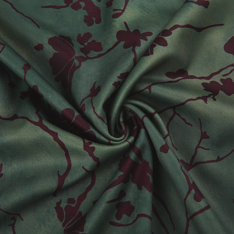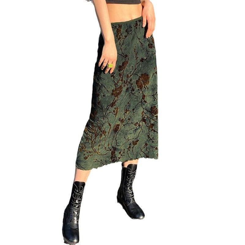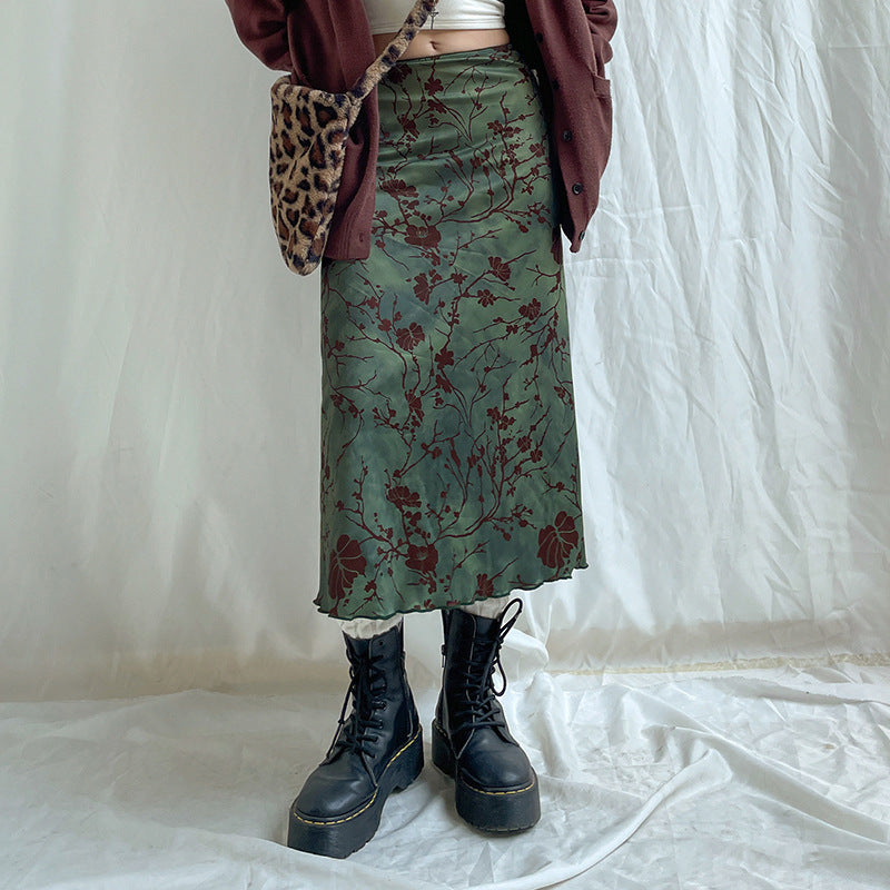 Neem je stijlaanwijzingen van alternatieve jaren 90 mode met de dameshoge taille flare midi rok met bloemendetails. Rode botanische ontwerpen wind rond de bosgroene stof.