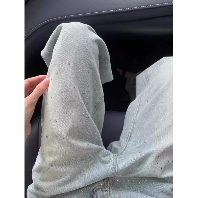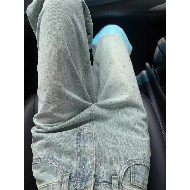 These glitzy jeans sparkle with embedded rhinestones along a streamlined high-waist cut. Their narrow wide-leg shape delivers a balanced silhouette with a luxurious finish. Great for nights out, runway-inspired looks, or standout streetwear.