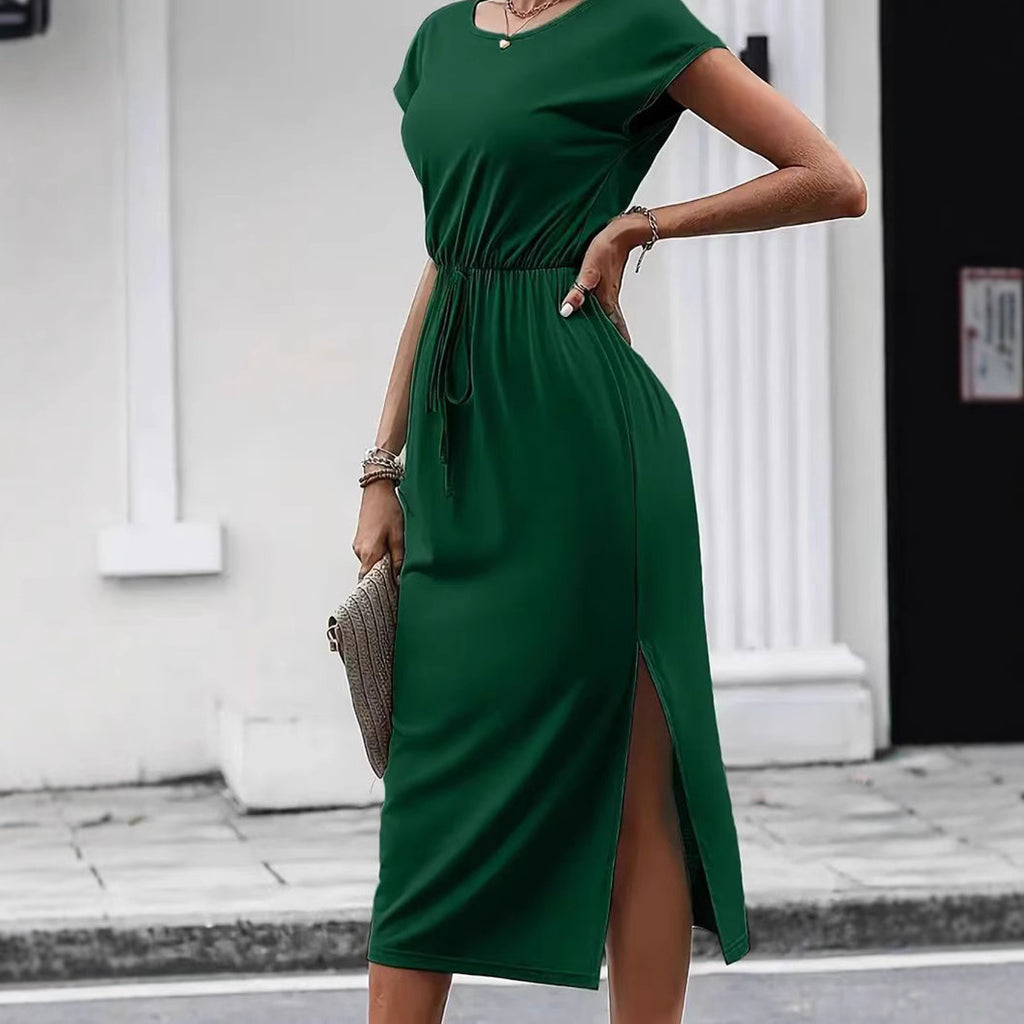 Effortless Simple Casual Round-Neck Short-Sleeve Dress with Cinched Waist