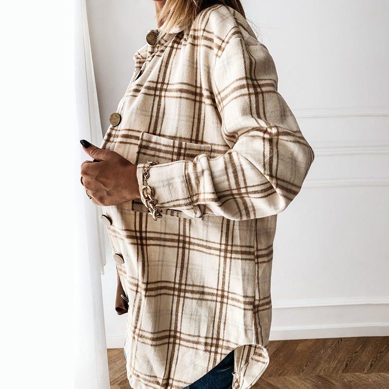 Leve a flanela a novos níveis com o botão inspirado em flanela feminino com um colarinho virado. Possui uma bainha mais longa do que a maioria das camisas de flanela e é completa com botões grandes e decorativos.