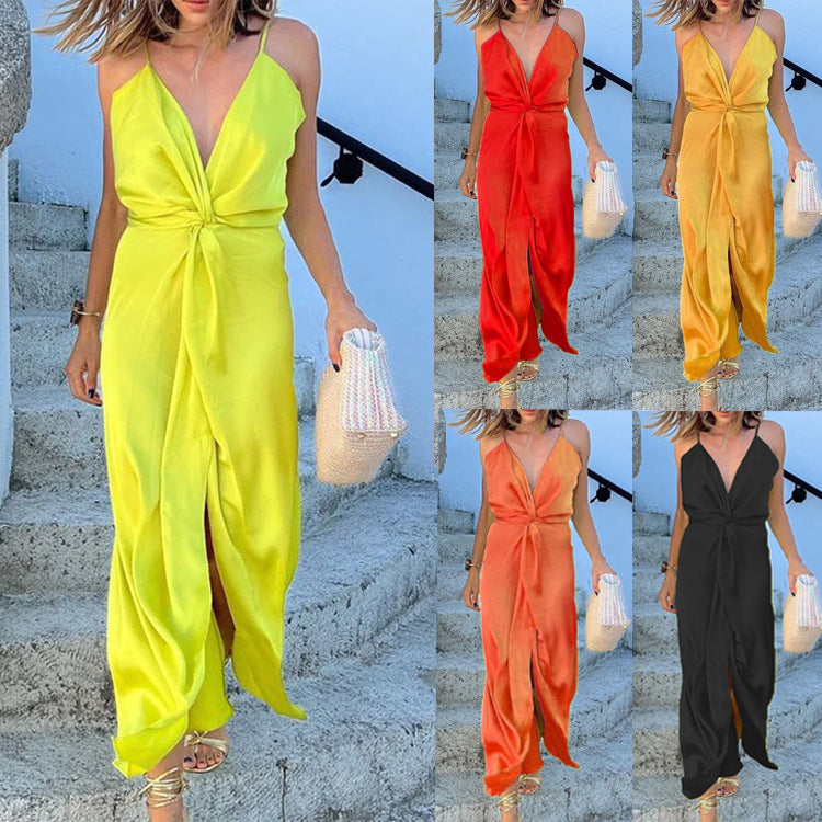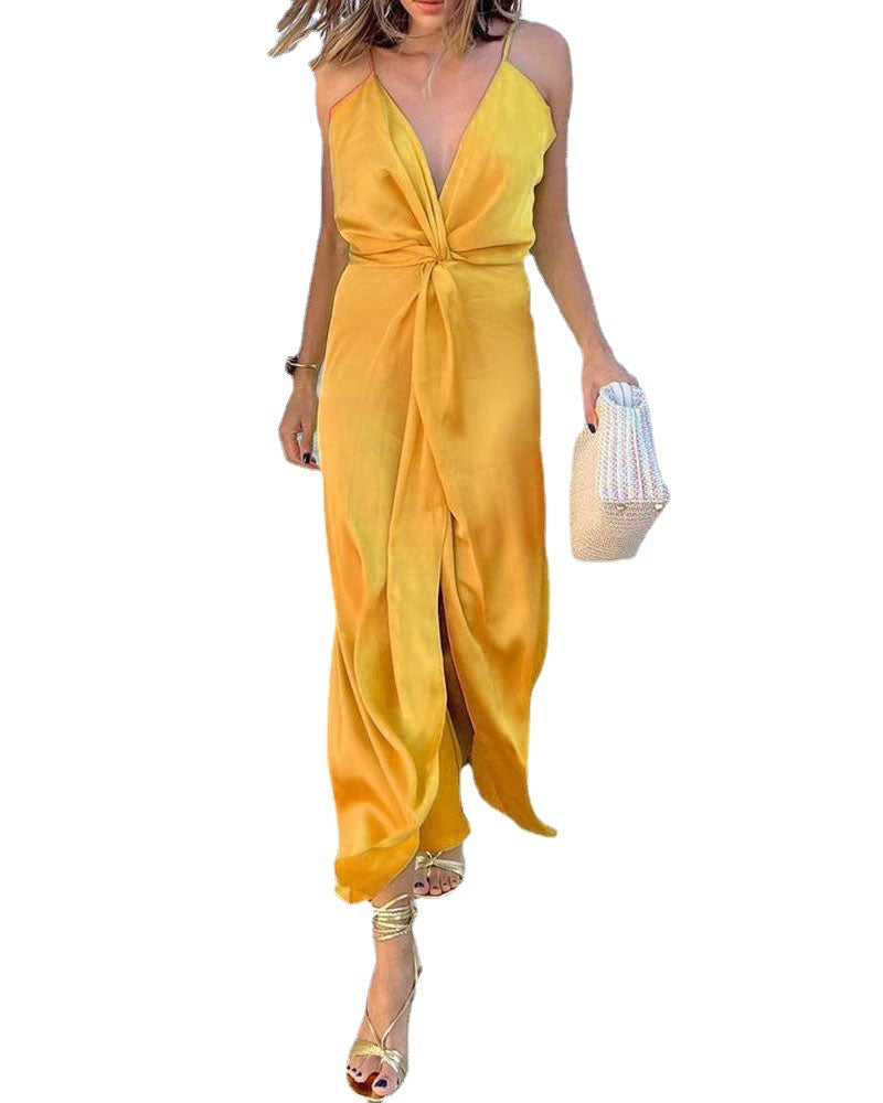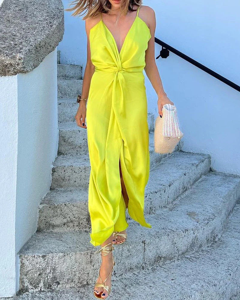 Faça uma declaração quando entrar na sala usando o vestido de decote em baixo em V feminino. O vestido solto vem em sua escolha de cores vibrantes, como amarelo, laranja e vermelho.