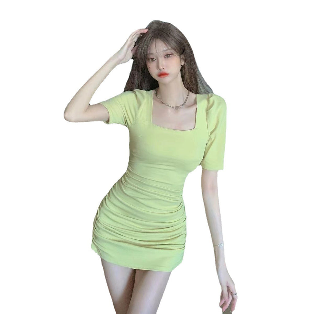 泡芙袖子緊身胸衣連衣裙配方領和百褶腰部