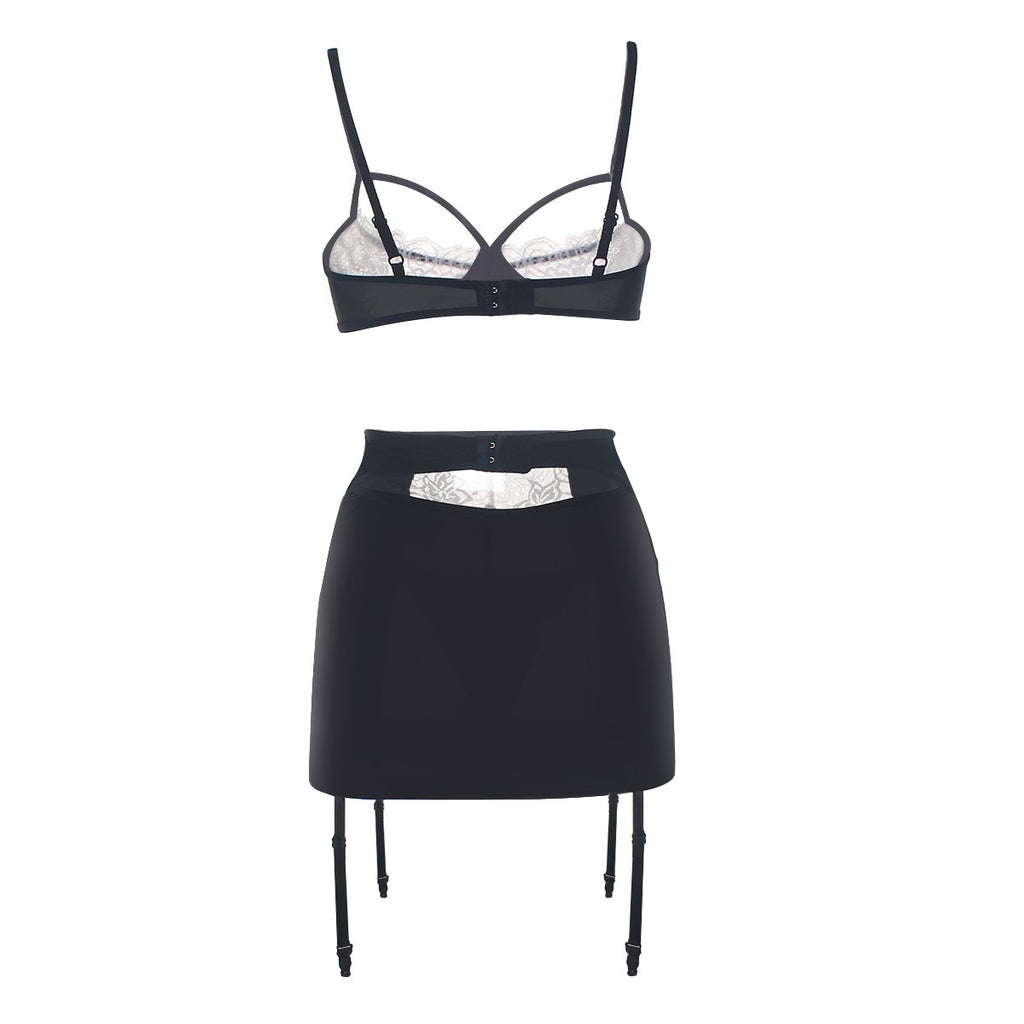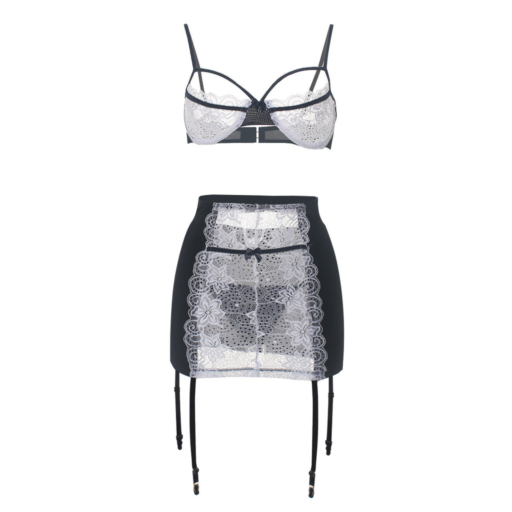 這件兩件套的高腰吊襪帶裙和胸罩套件具有討人喜歡的胸罩和匹配的蕾絲底部,並帶有永恆的誘人吊襪帶帶,以完成它。